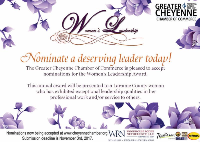 Annually the Greater Cheyenne Chamber of Commerce recognizes an outstanding woman who exhibits exceptional leadership qualities in her professional and/or service to others. The Women’s Leadership Award, formally known as the ATHENA Award, has been a lasting tradition in Laramie County. Nominations for this award are currently be accepted. It takes only a moment to submit a nominee but leaves a lasting impression on those who do so much for the community.